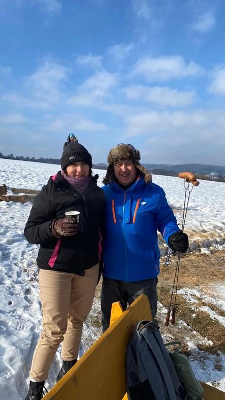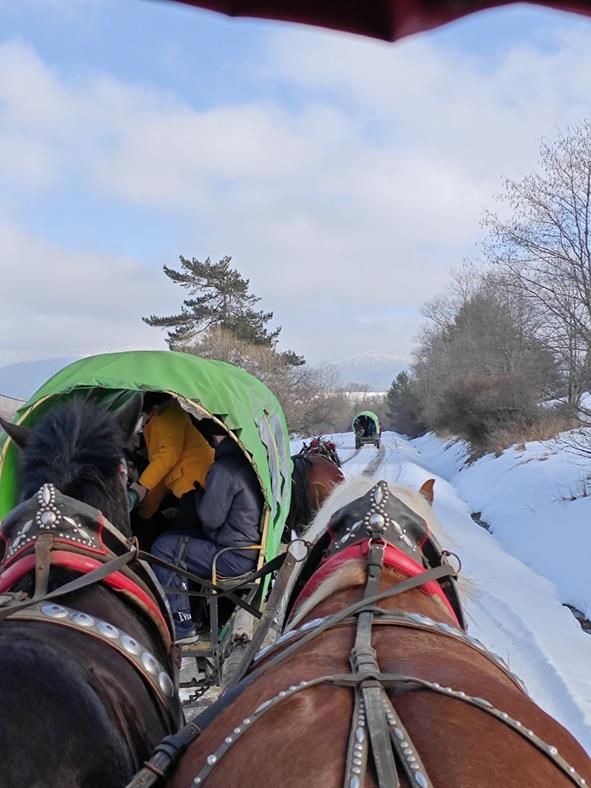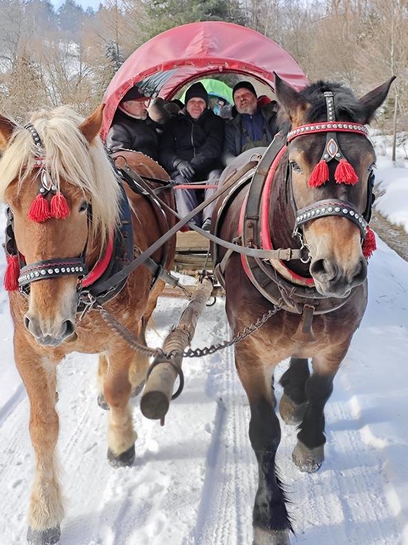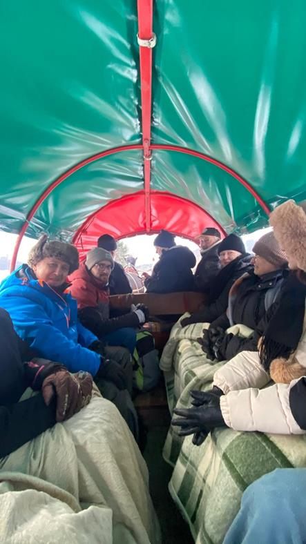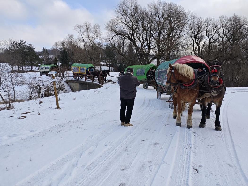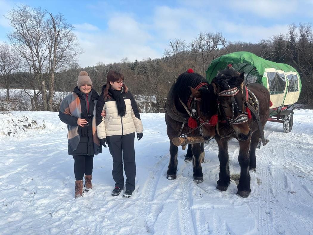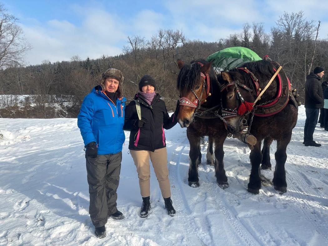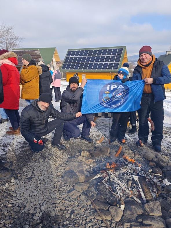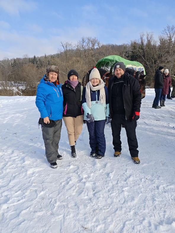 Niestety nie trafiliśmy na warunki umożliwiające kulig na saniach więc zabraliśmy się na cztery wozy, by wyruszyć w 4 kilometrową trasę przez Ciśniańsko-Wetliński Park Krajobrazowy dolinie rzeki Osława, i cieszyć się górską atmosferą i zimową scenerią. Chociaż niebo było częściowo zachmurzone, a termometr wskazywał -4oC to humory nam dopisywały. Po półtoragodzinnej jeździe zebraliśmy się przy ognisku, by smakować własnoręcznie upieczoną kiełbasę, zapijając grzańcem i degustując bieszczadzką nalewkę. Atmosferę podkręcał Pan Wojciech “KIJU” Gosztyła z “Kapeli Karpatia” opowiadając o tamtych terenach i ich historii.